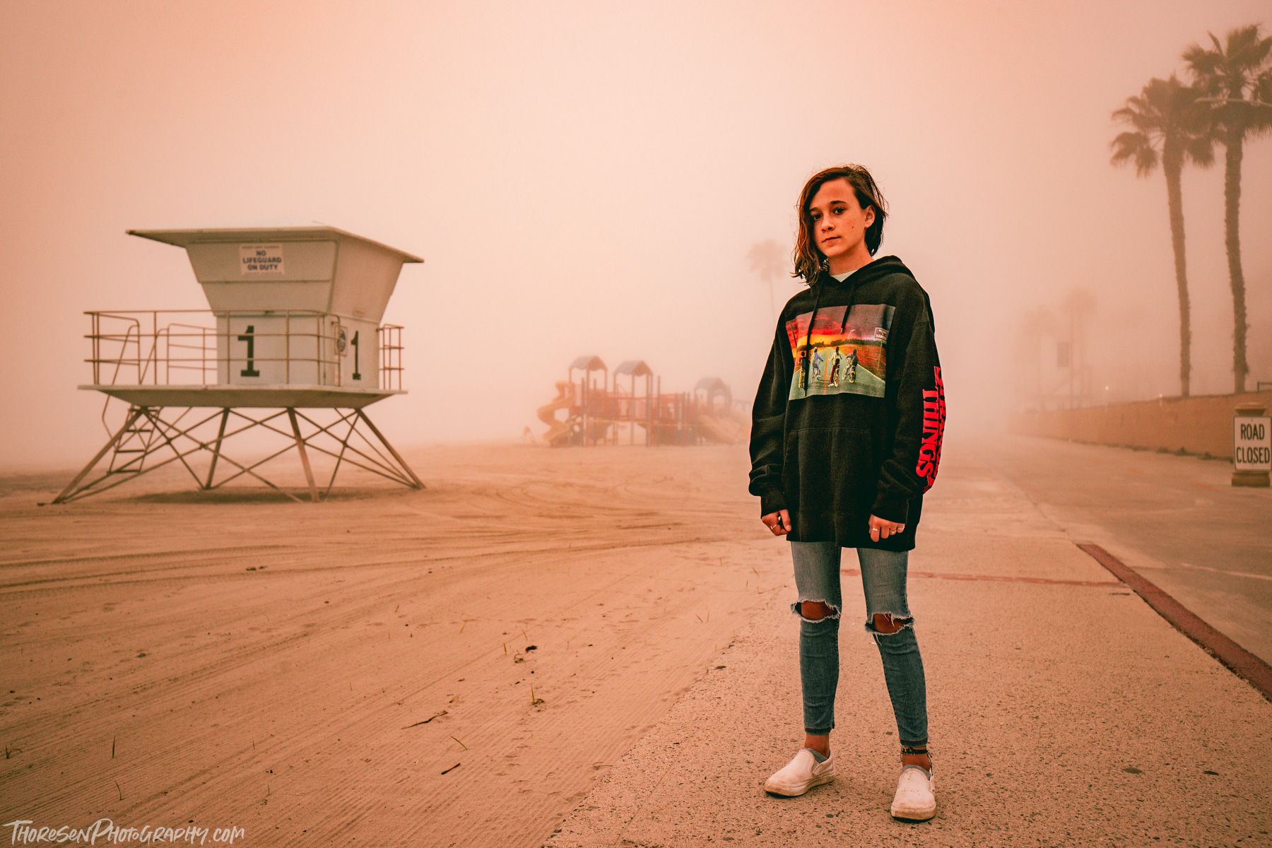50mm offers the closest perspective to human vision. This image seems to invoke more of an isolation, scarier feel than the image below., given that she is smaller than the surrounding area.